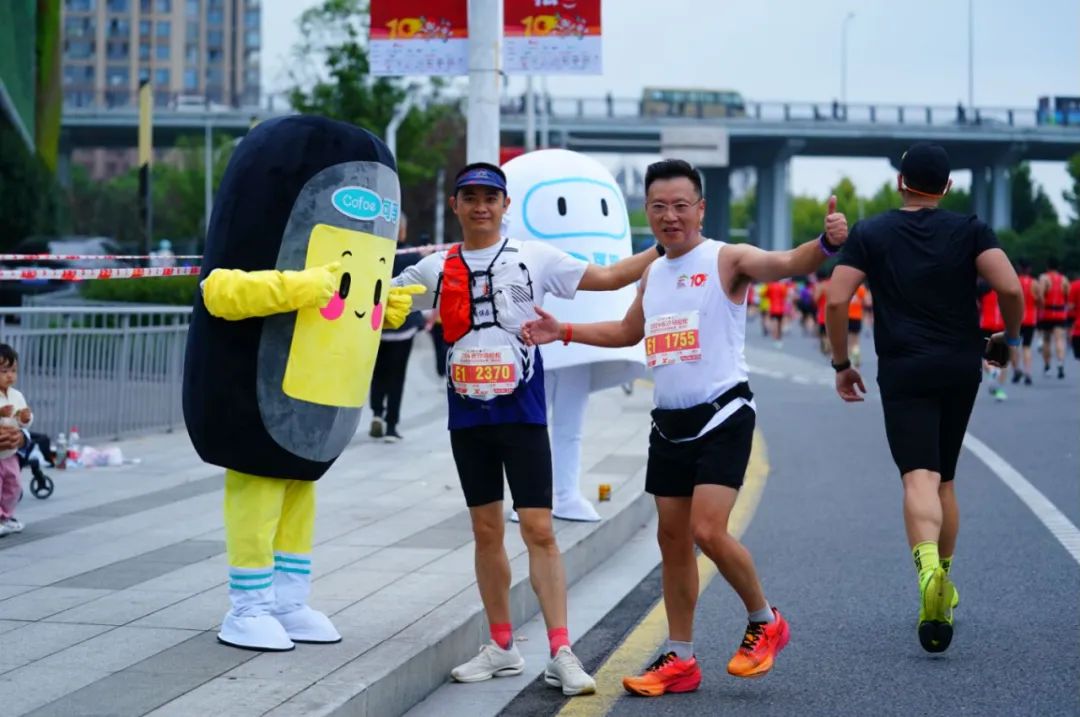 *在正賽加油點(diǎn),長馬選手與可孚超級(jí)條機(jī)器人偶合影互動(dòng)。